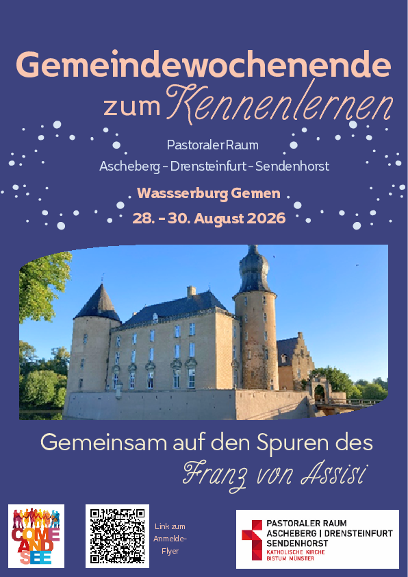 Vom 28.–30. August 2026 lädt der Pastorale Raum Ascheberg–Drensteinfurt–Sendenhorst zu einem besonderen Gemeinde-Wochenende ein. Drei Tage voller Inspiration, Austausch, Freude und gemeinsamer Erlebnisse erwarten euch – in wunderschöner Umgebung und mit einem vielfältigen Programm für alle Generationen.