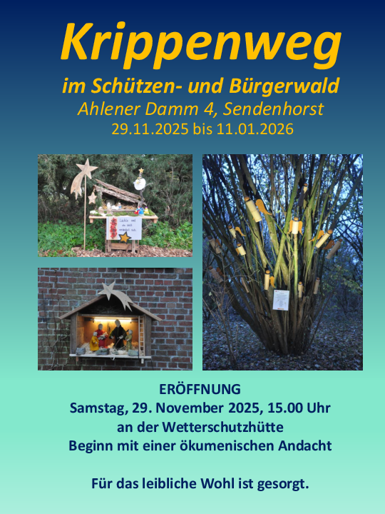 Wir laden alle Bürgerinnen und Bürger herzlich ein, Teil dieses besonderen Projekts zu werden! Ob als Gruppe oder Einzelperson – Ihre Kreativität ist gefragt. Die Anmeldung ist im Pfarrbüro (stmartin-sendenhorst@bistum-muenster.de / Tel. 02526-93040). Der Anmeldeschluss ist der 21. November 2025.