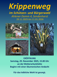 Lassen Sie sich auf dem Krippenweg von der Vielfalt der Darstellungen, der Ruhe des Waldes und dem Zauber des Advents berühren. Ob als Besucherin oder Gestalter – der Krippenweg im Schützen- und Bürgerwald lebt von Ihrer Teilnahme!
