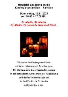 Am Donnerstag, 13.11.2025 sind alle Kindergartenkinder mit ihren Familien von 16 - 17 Uhr in die Pfarrkirche St. Martin eingeladen.